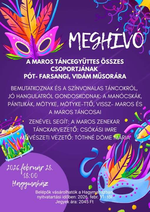 A MAROS TÁNCEGYÜTTES ÖSSZES CSOPORTJÁNAK PÓT-FARSANGI, VIDÁMMŰSORA